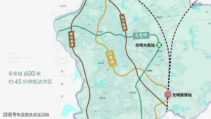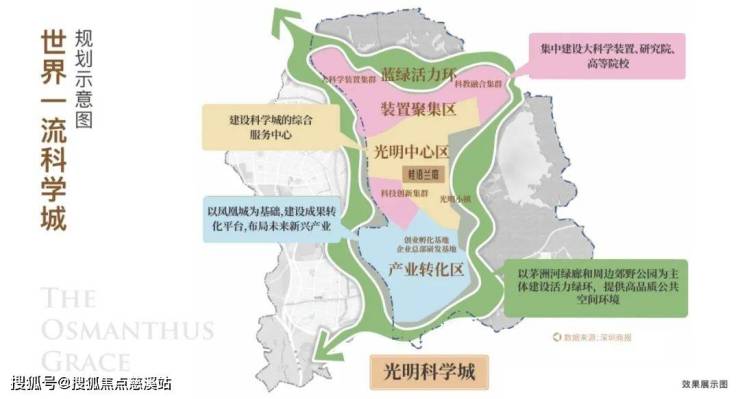 光明布局规划“一心两区”,“一心”即光明中心区,建设科学城的生活服务中心,集聚商业、居住、大型公共服务设施等顶级配套。