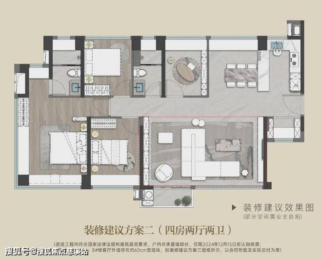 还可以将卧室打通,改成北侧约5米大飘窗的餐茶一体厅大四房。