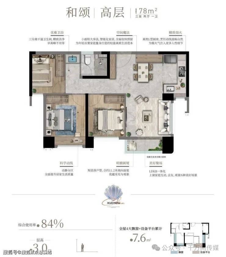 作为会展新城首个四代宅项目,海上雅颂主推78-132㎡三至四房,覆盖刚需、改善需求,整体得房率约84-107%。其中,高层层高约3米,四代宅层高约3.1米,整个空间感会更通透。
