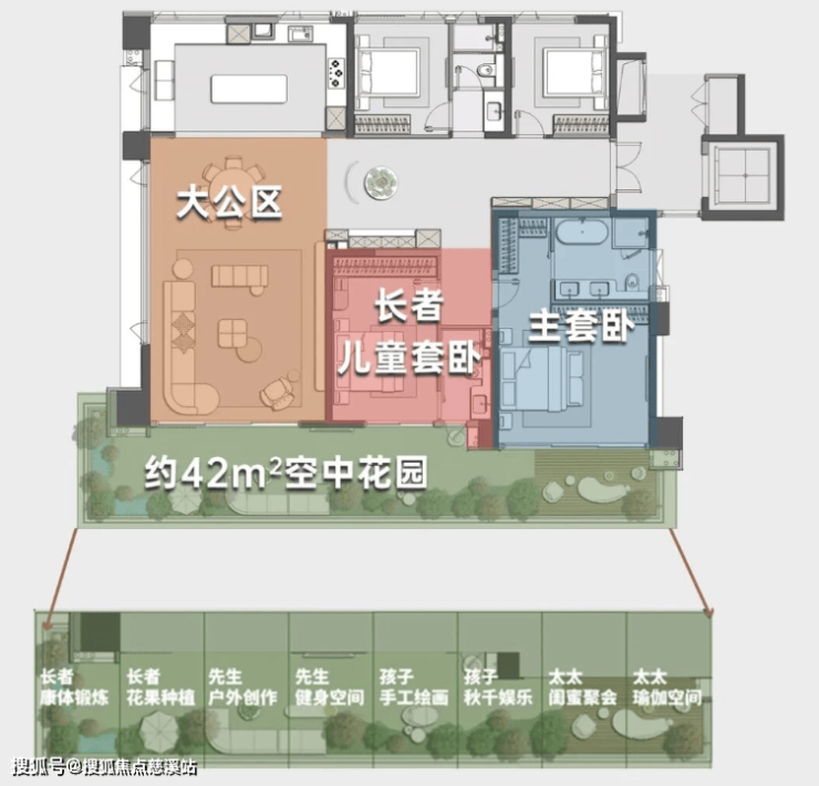 孩子们在露台上的秋千区欢笑玩耍,长辈则在专属种植区照料心爱的花草,每个人都能找到属于自己的惬意角落。
