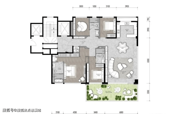 项目高层层高3米,露台挑高6米,小高层高3.1米,露台挑高6.2米