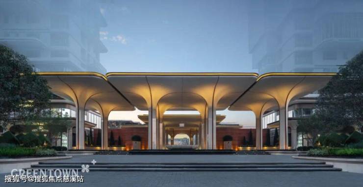 项目主入口,八棵高度约8米的“长安玉树”与贝金米黄石材、长安红陶板相结合,形成优雅的入口形象。两棵冠幅宽约10米、树龄约百年的桂花树阵列左右,营造出浓郁的归家氛围。