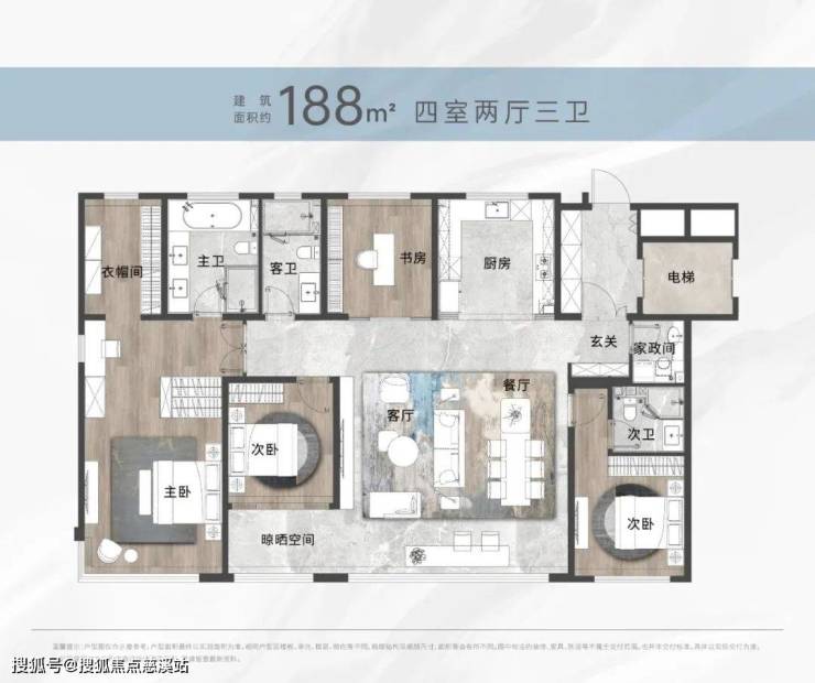 建筑面积约188㎡四室两厅三卫户型,金沙滩产品线"黄金段位"典范之作。既是改善需求的理想载体,更是进阶优居生活的战略跳板。