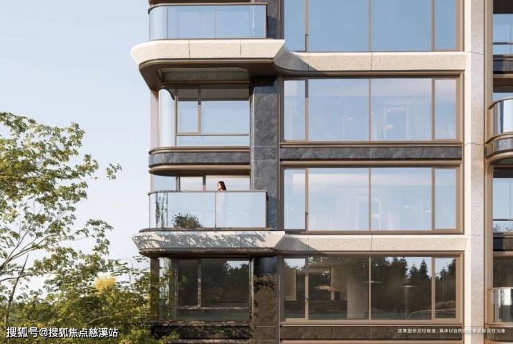 从建筑立面的首层石材+玻璃+仿石铝板、陶板+金属格栅,到全三玻两腔系统窗,再到导弧落地窗设计,皆对标高端住宅标准。