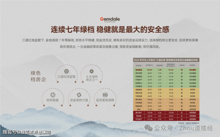 ▪金地集团成立于1988年,35载沉淀,布局全球86城,连续七年销售额破千亿。三道红线政策下连续七年零踩线,财务水平稳健,选择绿档房企更安全,投资更有保障。