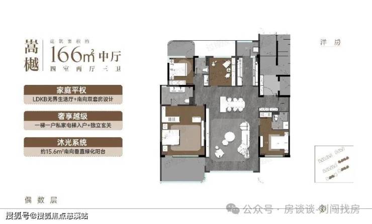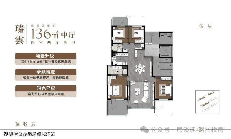 高层:136㎡四房,环幕端厅设计(边户客厅开间 7.3 米),奇偶错层小露台,精装交付
