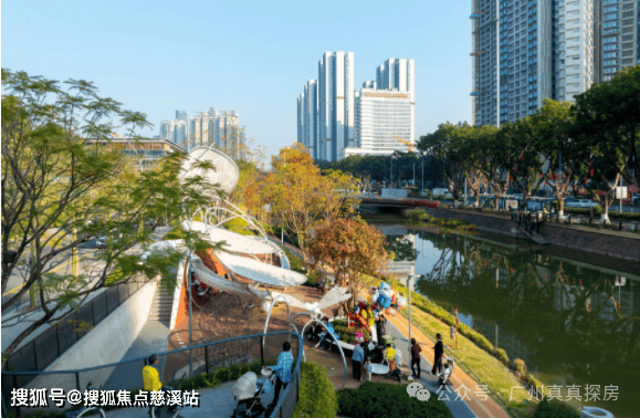 沿着公园碧道漫步而去,园内随处可见凌霄花、狗尾草等植物,繁花锦簇,绿树成荫,吸引不少路人驻足拍照打卡。还有各种健身器材和儿童游乐设施,各种昆虫造型的雕塑,增加了童趣,吸引不少家长带着孩子过来玩耍。