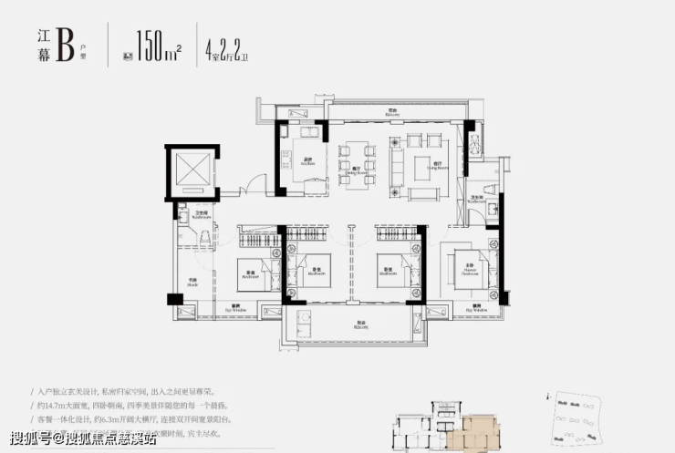 户型细节优化:以典型户型为例,170㎡户型具备约 17 米大面宽、短进深的特点,实现四房朝南,且部分房源具备观江条件;150㎡户型面宽约 14.7 米,同样为短进深、四房朝南设计,客厅宽度达 6.3 米,保留双阳台与双主卧套房,高层房源可瞰江,兼顾空间尺度与景观体验。