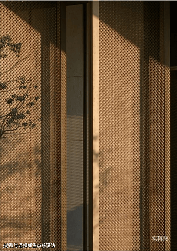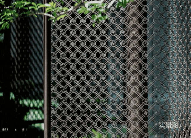 主入口处,6扇高约7米的金属屏风呈八字环抱列阵,如展开的方胜图腾。金属屏风双面錾刻交错方胜纹,当暮色四合,玉纹透光,如星子浮空。
