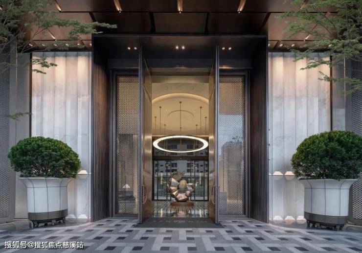 步入酒店式归家大堂,约280㎡空间承载海派至臻艺境,墙面贝金米黄石材以圆弧拉槽雕琢如玉般温润光影,如切如磋,如琢如磨。