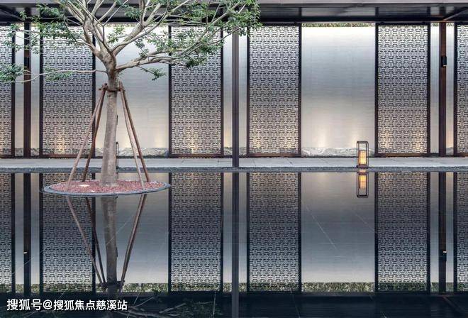 缓缓涌出的喷泉带来些许灵动的气息,拾阶而上,一幅苍松壁画映入眼帘。庭院内的景致透过圆窗展露一角,拉近建筑与人之间的距离,顿生亲近之感。