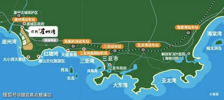 距离崖州高铁站3公里,距离凤凰机场26.5公里,南山货运港离4.5公里,中心渔港离项目5公里。