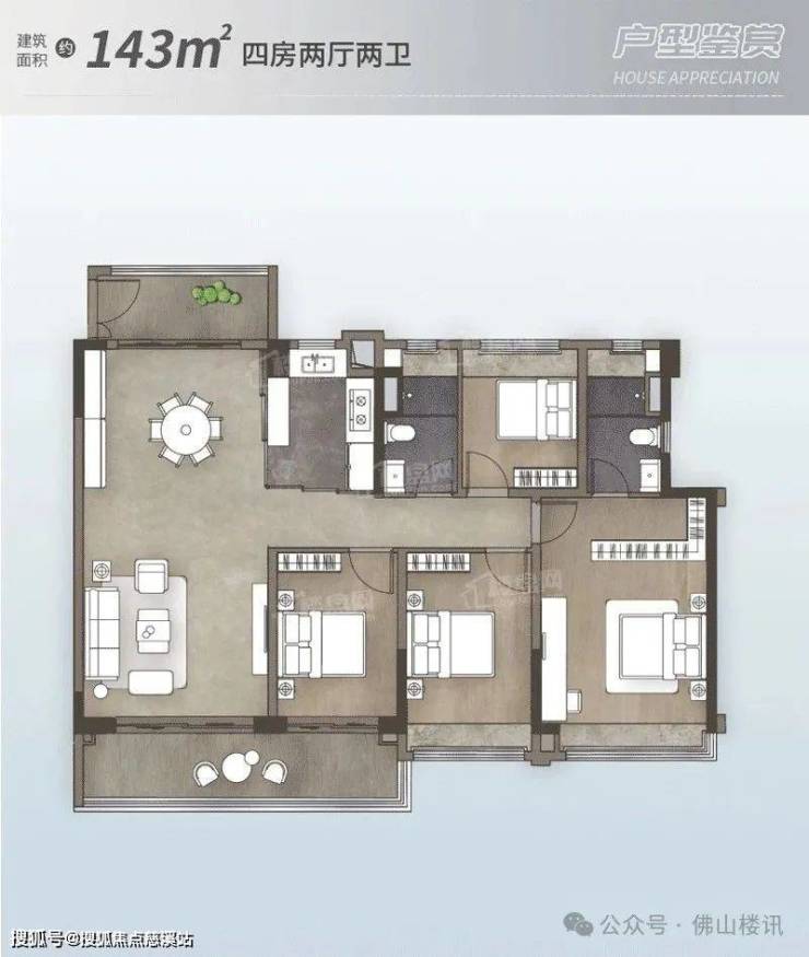 A区128㎡3+1房户型,四开间朝南设计,南向大阳台可满足家庭晾晒与休闲需求;143㎡南北对流户型,通过入户花园、双阳台配置,实现通风采光优化。
