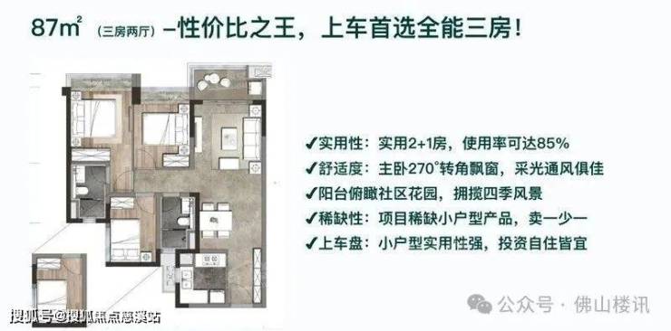 户型设计上,项目覆盖刚需、刚改、改善全周期需求。C区87㎡2+1房户型,通过飘窗和LDK一体化设计,空间利用率高;97㎡经典竖厅三房,主卧同样配备转角飘窗,阳台连通次卧,符合现代家庭生活习惯。