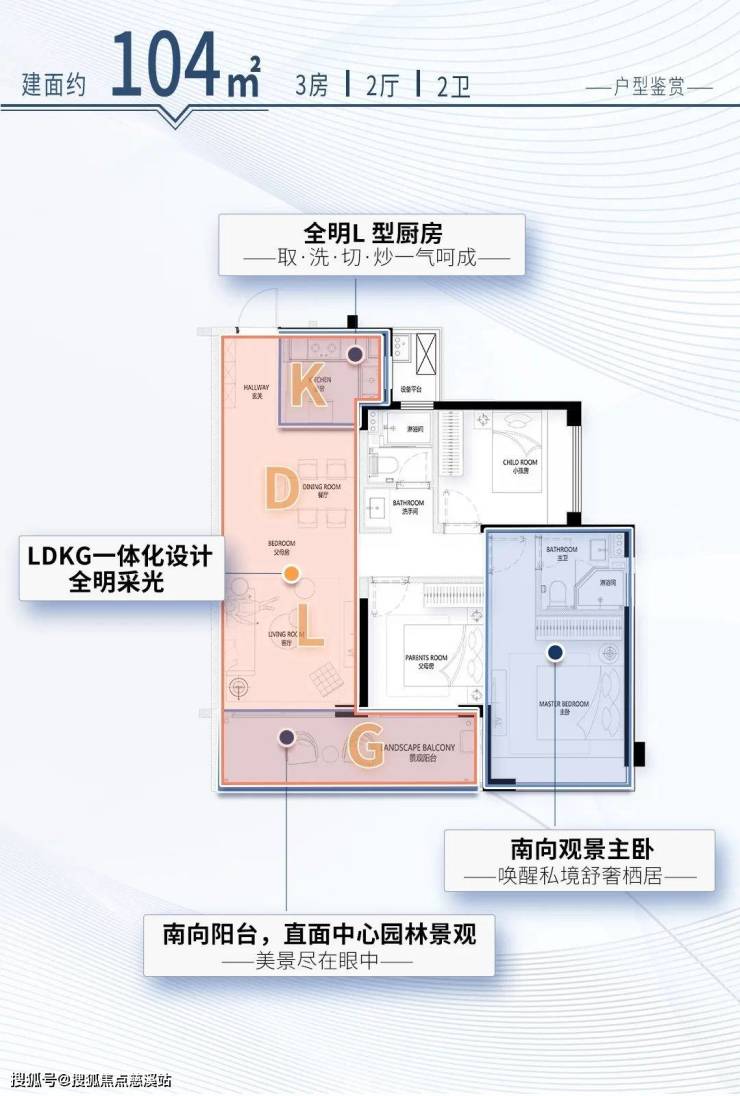 比如104㎡三室两厅两卫,经典的LDKG一体化布局,南向主阳台面宽6.6米,家中即可直面欣赏中心园林景观。