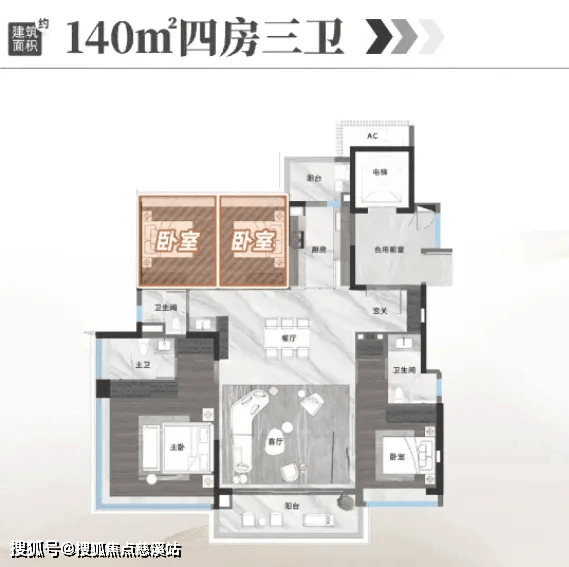 140㎡四房户型做到了私梯入户,“四叶草” 布局减少了空间浪费,南向面宽达 13.2 米,采光充足。客厅、厨房、阳台贯通形成约 40㎡的家庭社交区,主卧配备 270° 环幕观景窗,躺在床上就能看到湖景,适配科创精英家庭的需求。