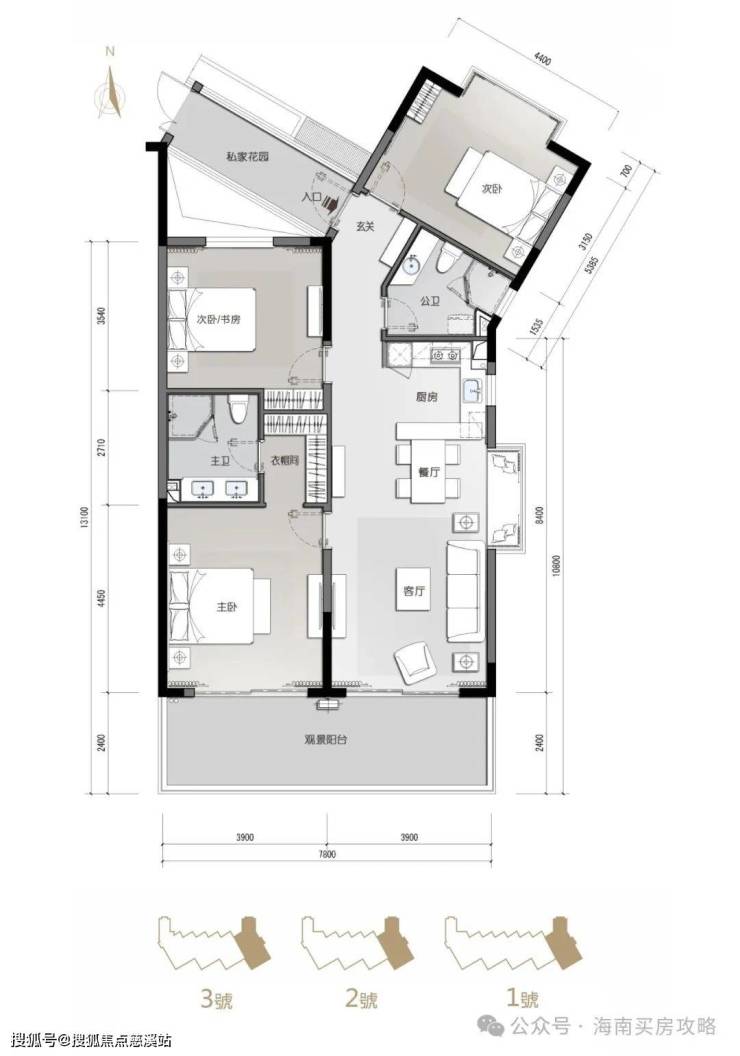 看海纯板房A1户型:130㎡3房2厅2卫