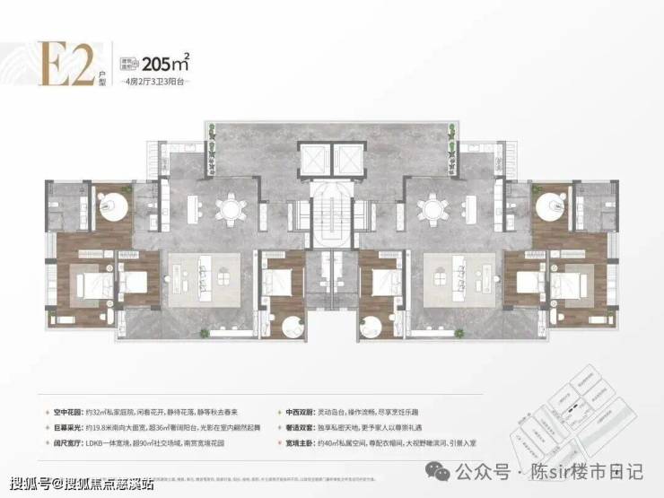 建面约205㎡户型中西双厨+灵动岛台+约32㎡庭院+约19.8米南向大面宽+超36㎡阳台+超90㎡社交空间+约40㎡主卧私人空间+双套房。