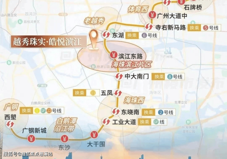 地铁:地块其实不近地铁站,最近2号线市二宫站距离约1.2公里,需要接驳,公共交通出行有壁。1站江南西/海珠广场,2站公园前/江南西;东侧10号线滨江东站,1站东湖,2站五羊邨,3站广州大道中。