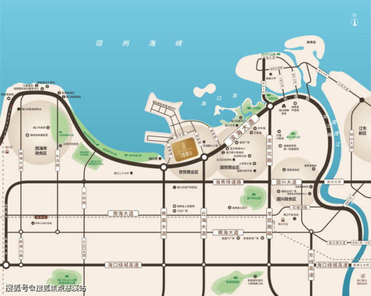 比邻滨海大道,西至西海岸,东至丘海大道、龙昆北路,距离:海秀快速路(约3km)、海口东站(约6.5km)、海口火车站(约13.4km)、美兰国际机场(约19km)。
