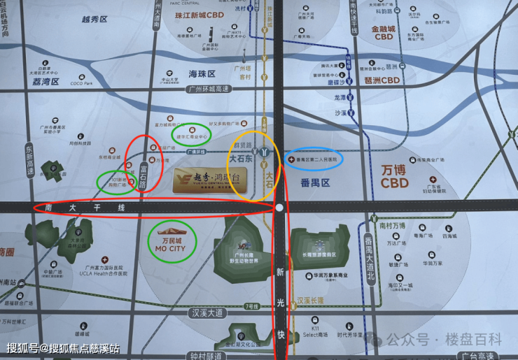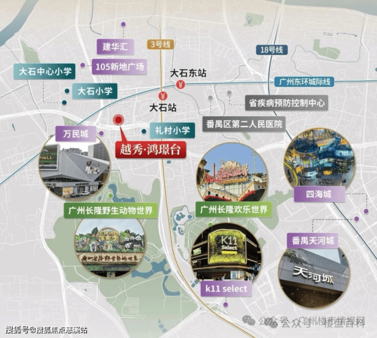 地铁——距离广州地铁3号线大石站约600米处,1站汉溪长隆,6站直达珠江新城;还有广州城际大石东站旁,2站琶洲、3站金融城,与3号线交汇;26号线群贤路站(规划中),5站客村,6站珠城;佛山4号线二期大石站(规划中),高效串联佛山、荔湾、海珠、番禺;