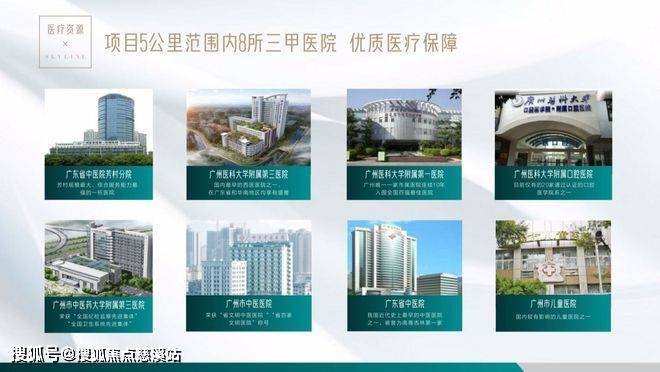 项目5km范围内共有8所三甲医院——其中有全国排名 29 的广州医科大学附属 第一医院(4 公里),全国排名 57 的广东省中医院(3.6 公里)、以及广东省中医院芳村分院(1.2 公里)、 广东医科大学附属第三医院(1.6 公里)、广州医科大学附属口腔医院(1.3 公里),广州市中医药大学附属第三医院(4 公里)、广州市儿童医院(3.4 公里)、广州医科大学附属中医医院(2.2 公里)等。
