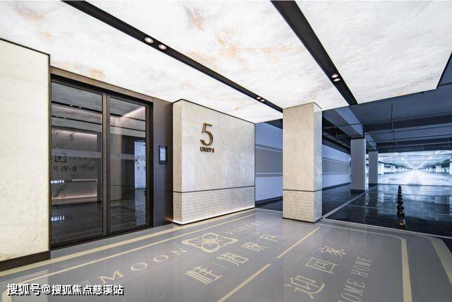 精致优雅的地下光厅,光顶采用泛光云石纹理质感软膜天花照明,墙面则是米灰色仿大理石瓷砖+古铜色金属腰线装饰,地面米色环氧地坪材质,搭配醒目的楼栋标识设计系统,营造了业主便捷而又尊贵的归家体验。