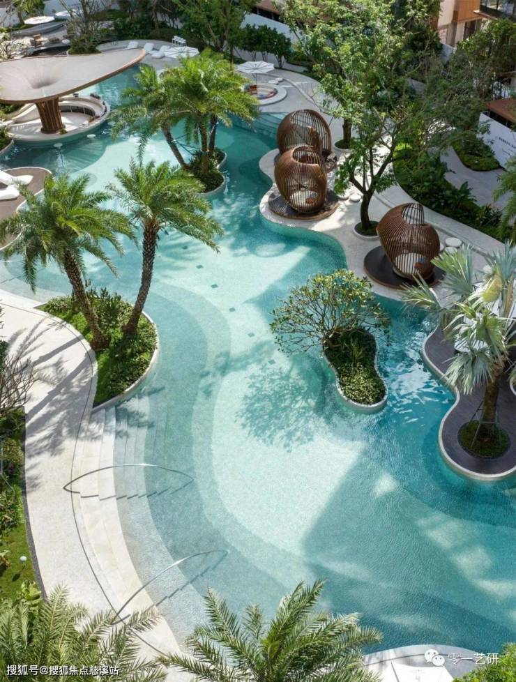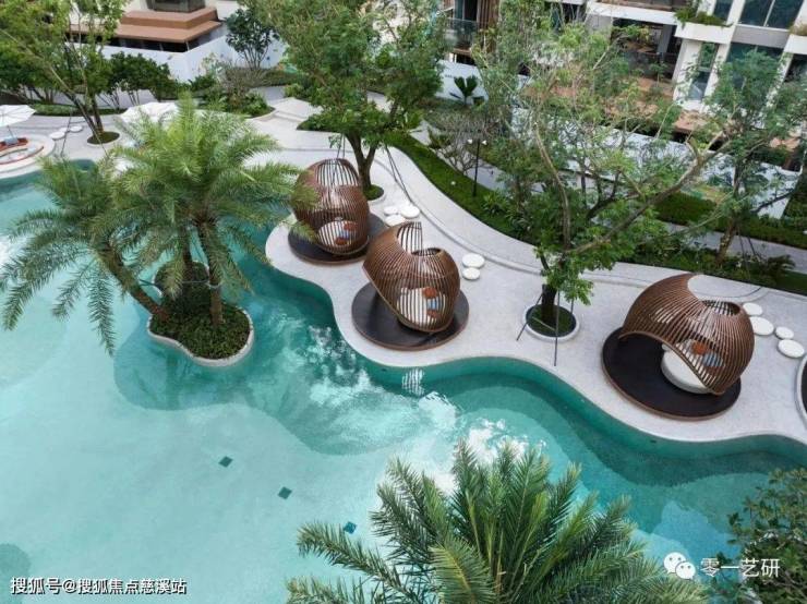 洋房区以泳池为核心进行功能展开,自然流动的曲线,放松的海岛布置,风情的凉亭餐吧,多样的场景体验,都在创造具有独特在地符号和场所记忆的艺术空间,紧密围绕这些开展社区的水上活动,泳池派对,同时又是一种热带海岛的度假体验。