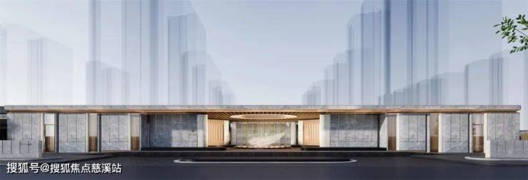 两侧立面采用爱马仕灰石材,搭配白冰玉奢石,营造出三列九阵迎宾立面。