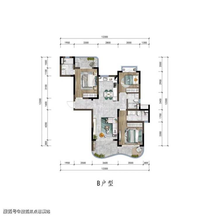 ▼“B”户型图约118㎡三室两厅三卫▼