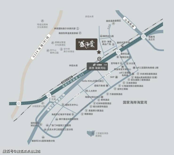 交通超便利,距离三亚市中心约 28km 、海棠湾高铁站(规划中)约 2km 、三亚凤凰国际机场约 35km 。周围商业氛围浓厚,CDF 免税城、河心岛、太古里、SKP、超级万象城等旗舰商业云集 。医疗资源也很优质,北大口腔医院三亚医院、301 解放军总医院海南医院为健康保驾护航 。教育资源同样不逊色,人大附中、美国卫斯理安国际学校等构建起 12 年一站式教育体系 。这里还是旅居胜地,汇集 32 家顶奢五星级酒店,亚特兰蒂斯水世界、蜈支洲岛等旅游地标都在附近 。而且周边生态资源丰富,甘什山岭、槟榔谷、南田温泉、神泉国际高尔夫俱乐部相伴,妥妥的自然栖所。