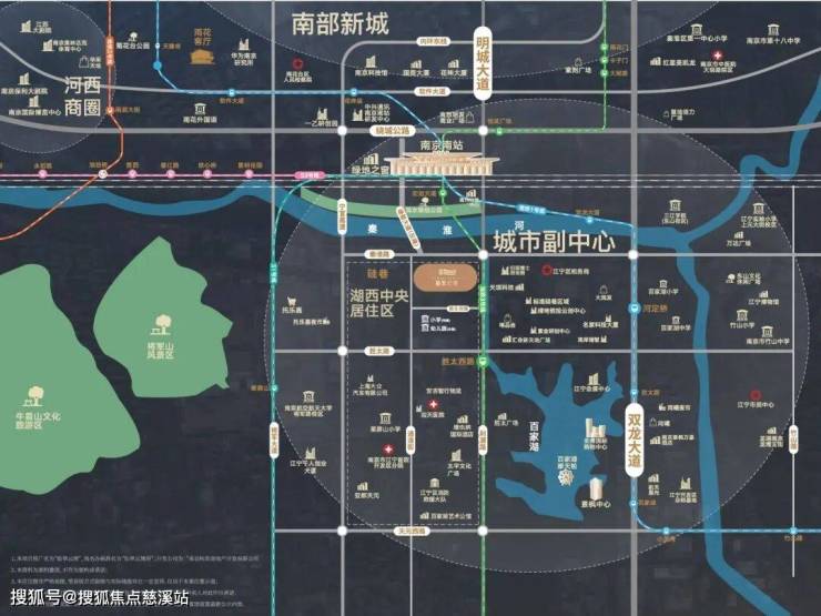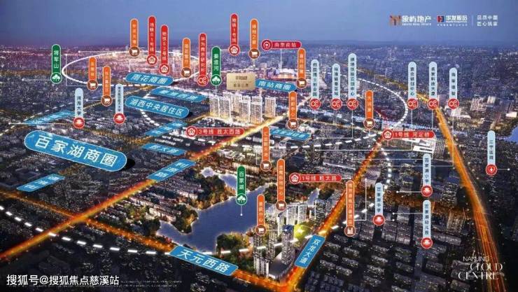 项目地处百家湖核心,左手南站,右手百家湖商圈,周边汇聚景枫Kingmo、江宁金鹰等大型商业综合体,步行可达地铁3号线胜太西路站,距南京南站约1.6km,交通便捷。