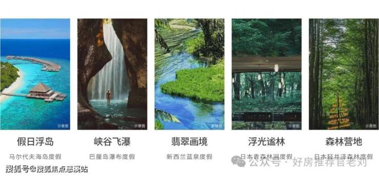 约5万㎡园林,一轴双环私藏五大度假场景,汲取马尔代夫海岛风情、巴厘岛瀑布景致、新西兰唯美画境、日本青森林涧与轻井泽森林幽境,松弛有致,自然而然,在地化演绎日常的度假生活体验。