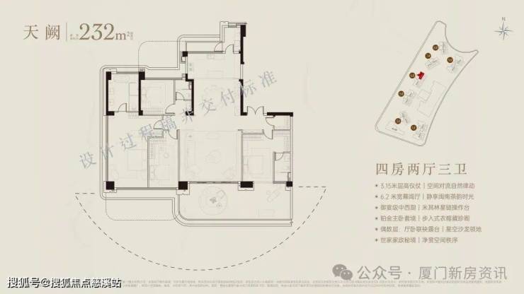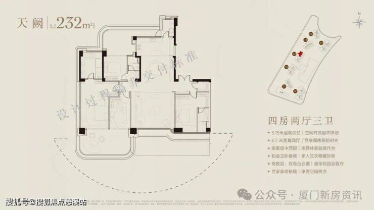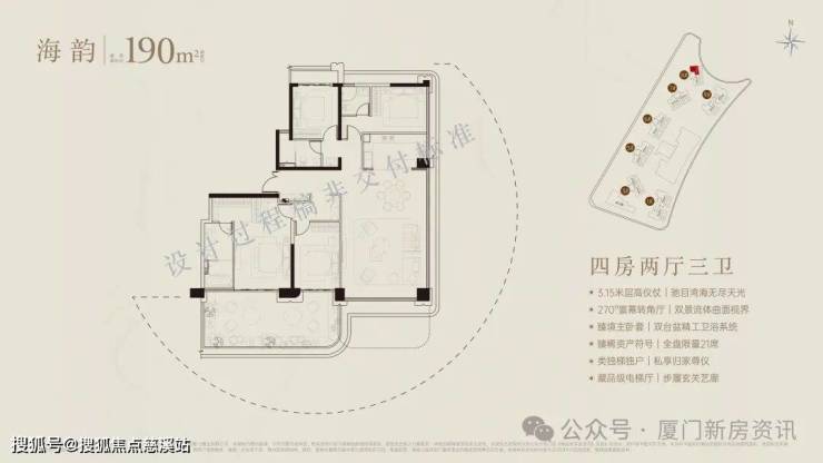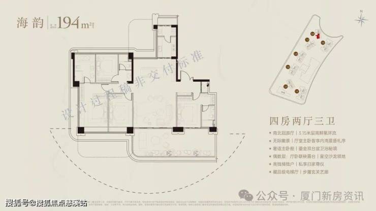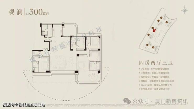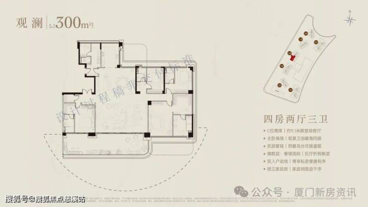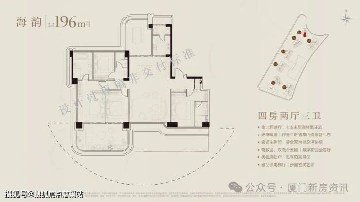 主推建面约188-436平四代私定大宅,共274户四代奢宅,户户空中花园,户户观景,综合使用率近100%,最大环幕视野达到270°,其中,约191平仅21套,约436平鼎豪仅16套!