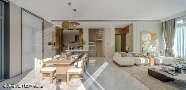 首层约35㎡自由客餐厅,完美迎合全家人的社交与休闲活动。通过巧妙整合阳台区域,空间的横向进深得以延伸至9米,进一步放大生活空间,让家庭聚会和娱乐活动更加自如。