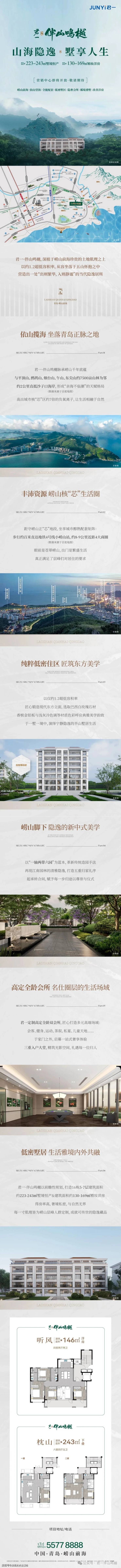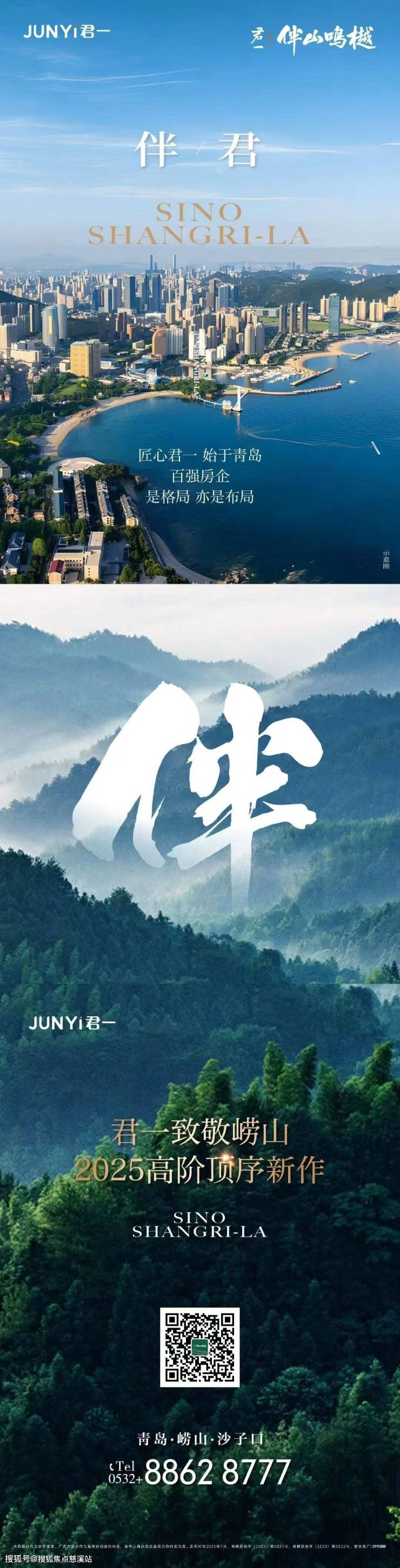 君一·伴山鸣樾位于青岛市崂山区九水东路657号甲,由青岛畅远置业开发,定位为低密山海墅居社区,容积率仅1.2,绿化率40%-45%,主打5-7层花园洋房及叠墅产品,建筑风格融合现代东方与法式元素,外立面采用香槟金与浅灰冷色调搭配石材。