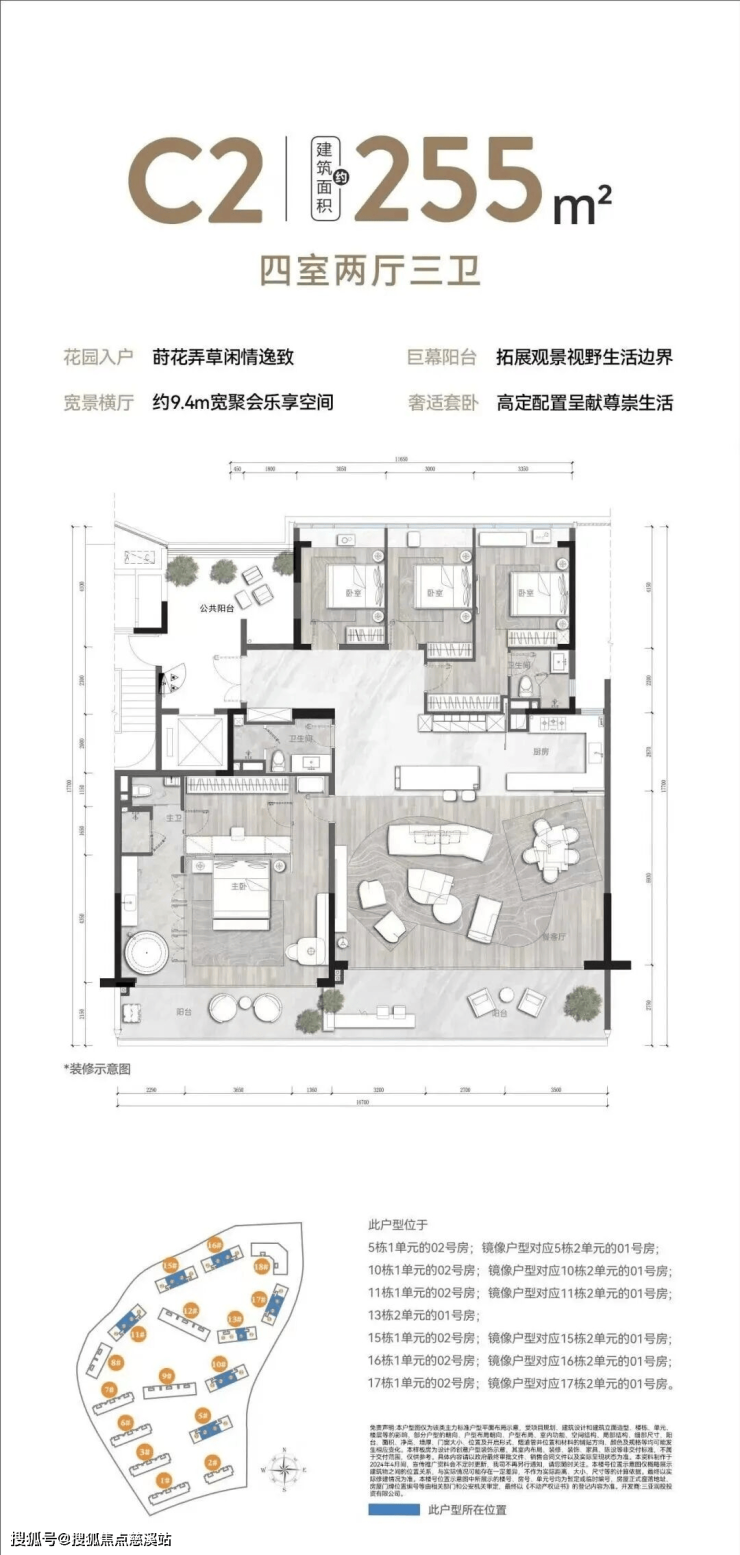 :花园入户设计,莳花弄草享闲情;约 9.4m 宽景横厅,聚会待客更从容;巨幕阳台拓展观景视野与生活边界;奢适套卧高定配置,彰显尊崇生活。