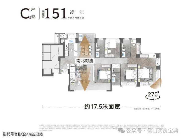 C2同样是南北对流双阳台设计,4.5开间朝南,南向面宽达到17.45米。