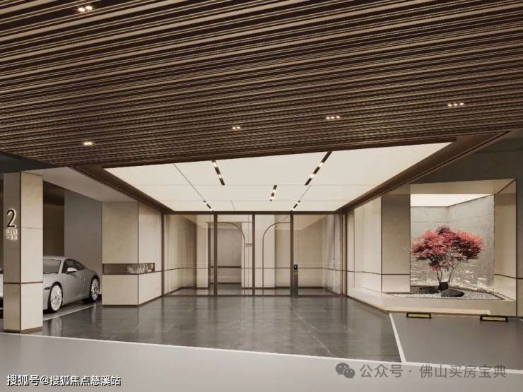 对标顶级豪宅的地下车库——入口两侧以环形灯带搭配大理石材,大堂采用铝格栅天幕吊顶,地面采用环氧金刚砂打造而成,作为归家第二重入户大堂,延续业主的归家仪式感。