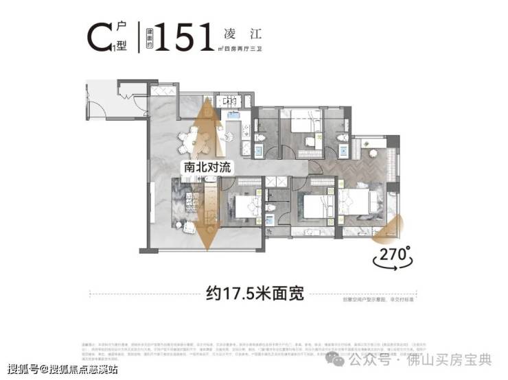 这个户型设计为4.5米开间朝南,南向面宽超过17米,也是南北对流双阳台,景观阳台连通次卧。