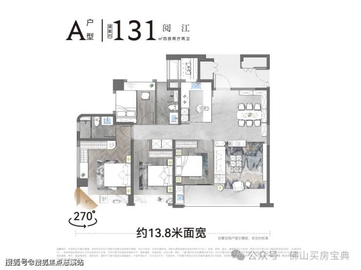 四开间朝南,南向采光面达到13.4米,其中景观阳台连通次卧,面宽达到6.5米。