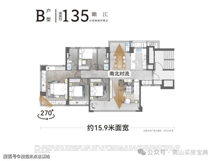 这个户型也是四开间朝南,南向面宽达到15.8米,设计非常能打。