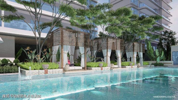 秉承热带隐奢酒店泳池场景美学,泳池旁绿意掩映,设置休闲廊亭、躺椅等,泳池内规划亲子按摩池、家庭泳池等分区,集聚、停、憩、赏为一体,享受避世的休闲和海岛休闲日常。