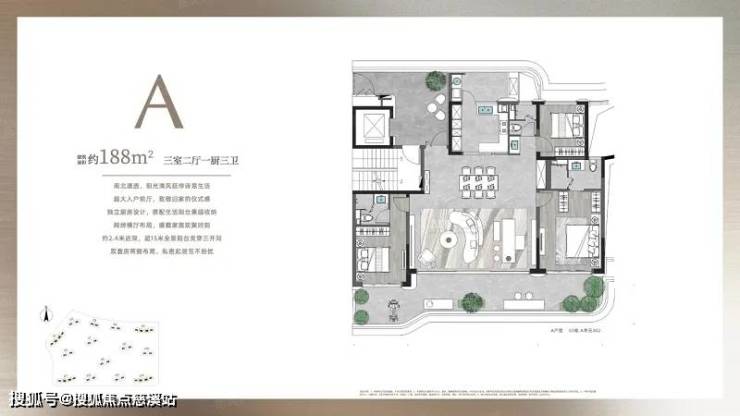 约 188㎡三室二厅一厨三卫:南北通透,超大入户前厅彰显归家仪式感,独立房带生活阳台,绰横厅布局,约 2.4 米进深、超 15 米全素用台贯穿三开间,双营两侧布局保障私密起居。
