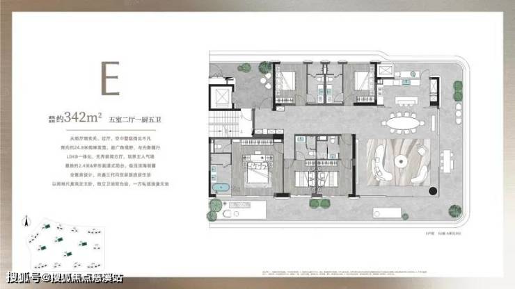 约 342㎡五室二厅一五卫:从前厅到玄关、过厅,空中聚级见不凡,南向约 24.8 米属绰面宽超广角视野光影随行,LDKB 一体化无界朗方厅彰显主人气场,挑约 2.4 米 & 环形跑道式阳台极目稀幕,全套房设计共鉴三代同堂家族族居生活,主卧独立卫浴双台盆一方浪漫天地。