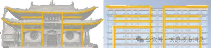 吸取东方美学气韵,提取龙城古建筑中“屋面飞檐”和“中轴对称”元素,营造屋檐飞逸灵动之感的同时勾勒出建筑几何立体质感。色调上深灰与香槟金交融,沿袭古建筑金碧辉煌的贵气特征。古今辉映,成就晋阳湖畔一抹绝色。