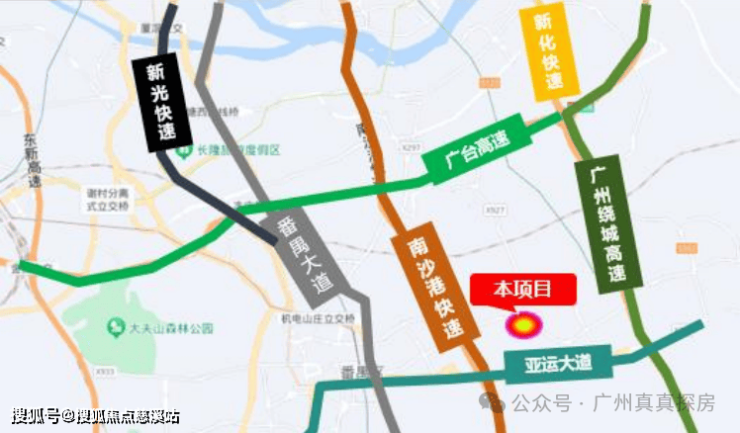 离南沙港快速出入口约900米;通过南沙港快速路,约20分钟到达万博,30分钟内到达琶洲,35分钟内到达珠江新城;同时通过亚运大道链接番禺大道、广州绕城高速1小时内接驳其他高速可达到大湾区各核心城市;