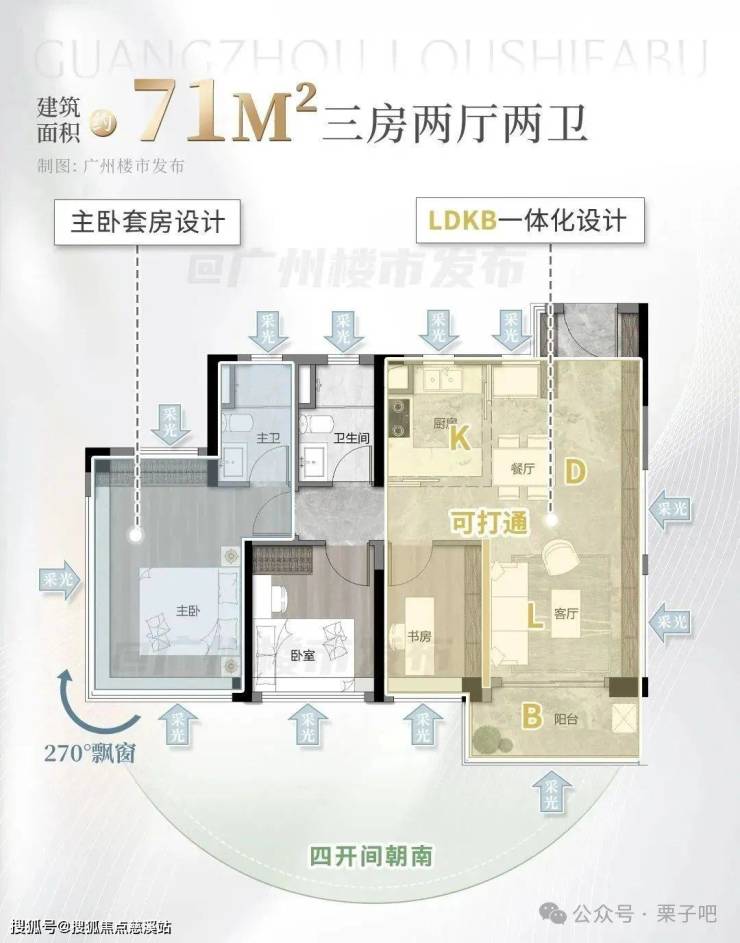 赠送率超20%,71㎡≈90㎡体验,三房两卫+双飘窗。南向三空间两卫户型,新规户型流行元素一应俱全,主卧270°L型飘窗揽尽阳光。