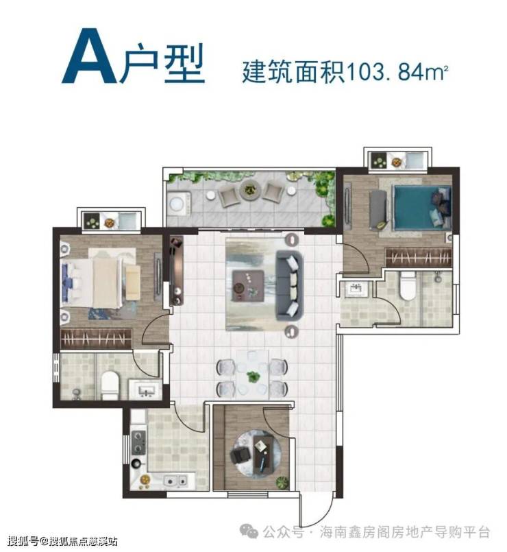 户型分为A型103.84㎡、B型115.86㎡、C型112.38㎡,A+复式型199.19㎡、B+复式型215.72㎡、C+复式型231.04㎡六种。