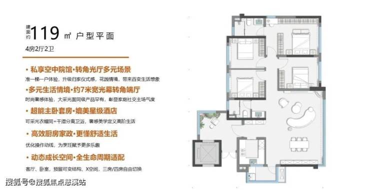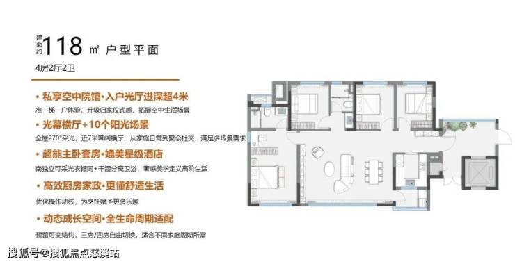 区别于传统的“T字型”和“工字型”T4,除了每一户都有全明电梯入户空间,金茂晓棠还调整了产品格局,将东侧翅膀户主景观面由朝北变为朝东,直看中庭,让每一户都能享受270°景观面。